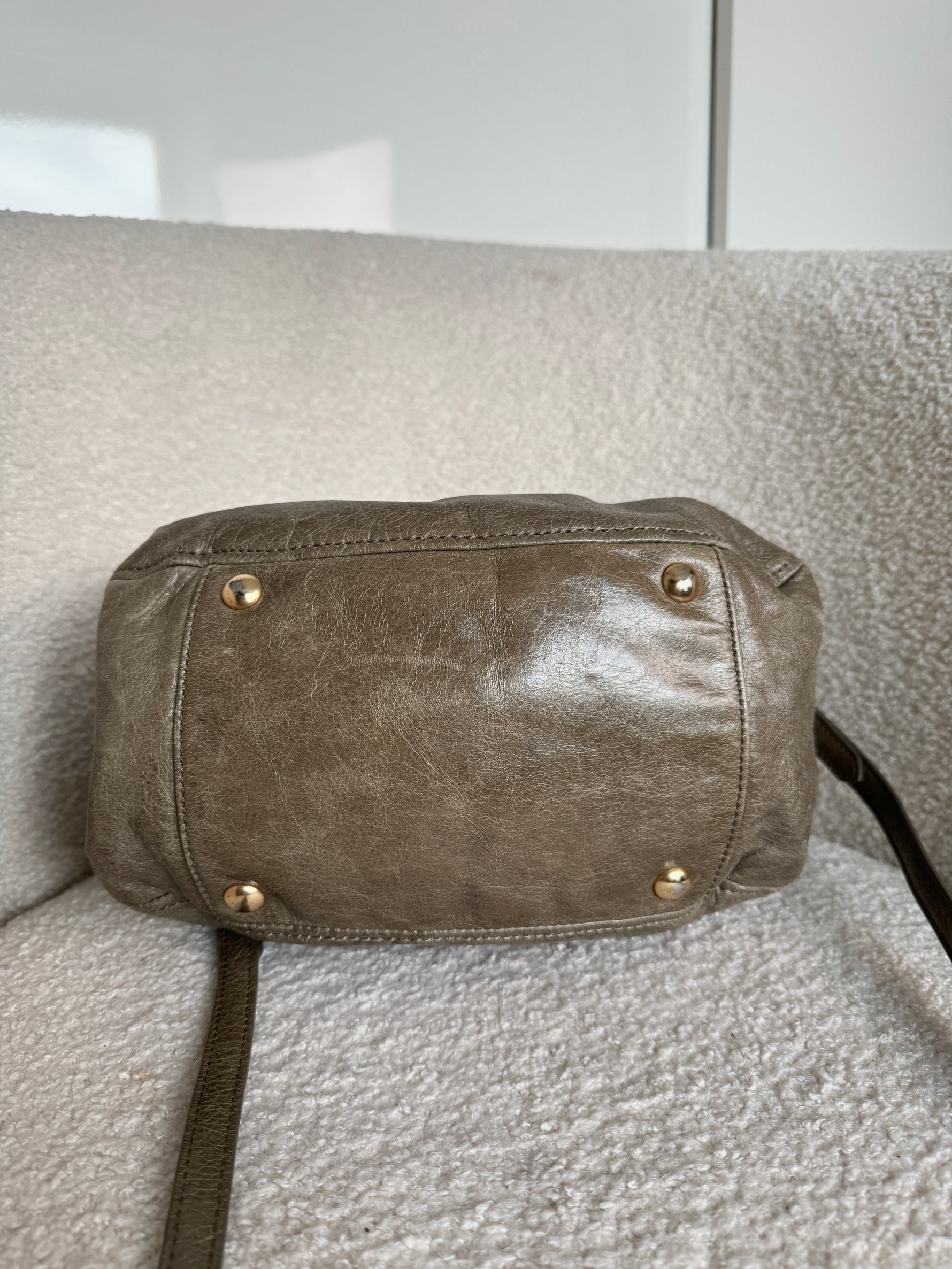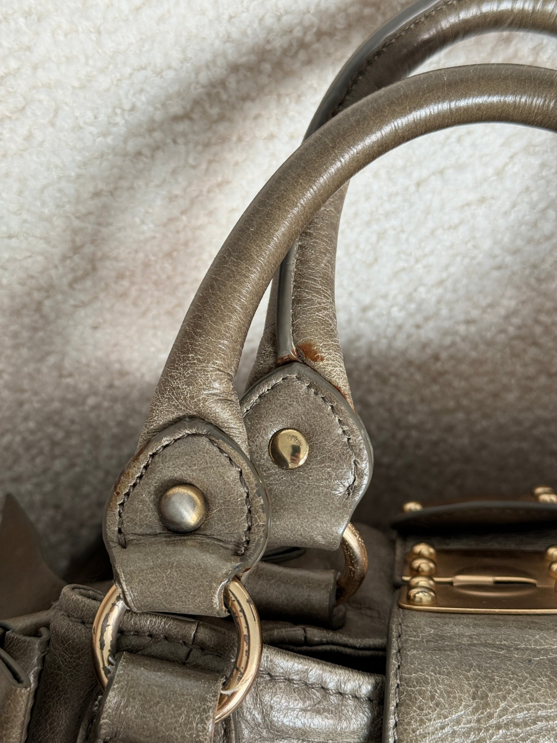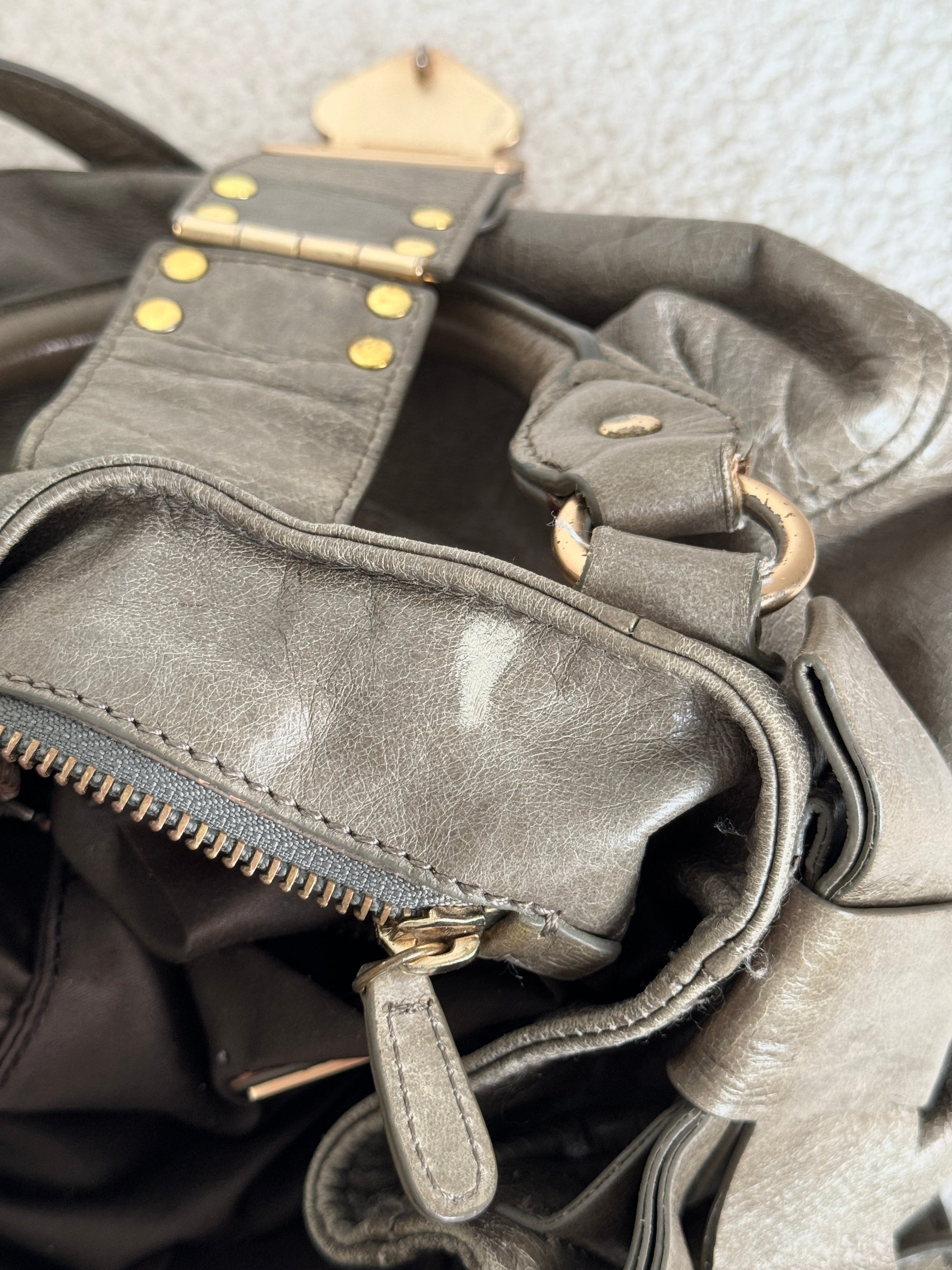 Outside: some tiny small scratches / general wear to the leather. Corners are mildly scuffed. Gold buckle is scratched.