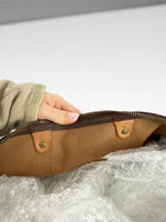 Outside: Very good condition throughout, hardware is tarnished, some water marks to leather, some scuffs to the corners of the bag.
