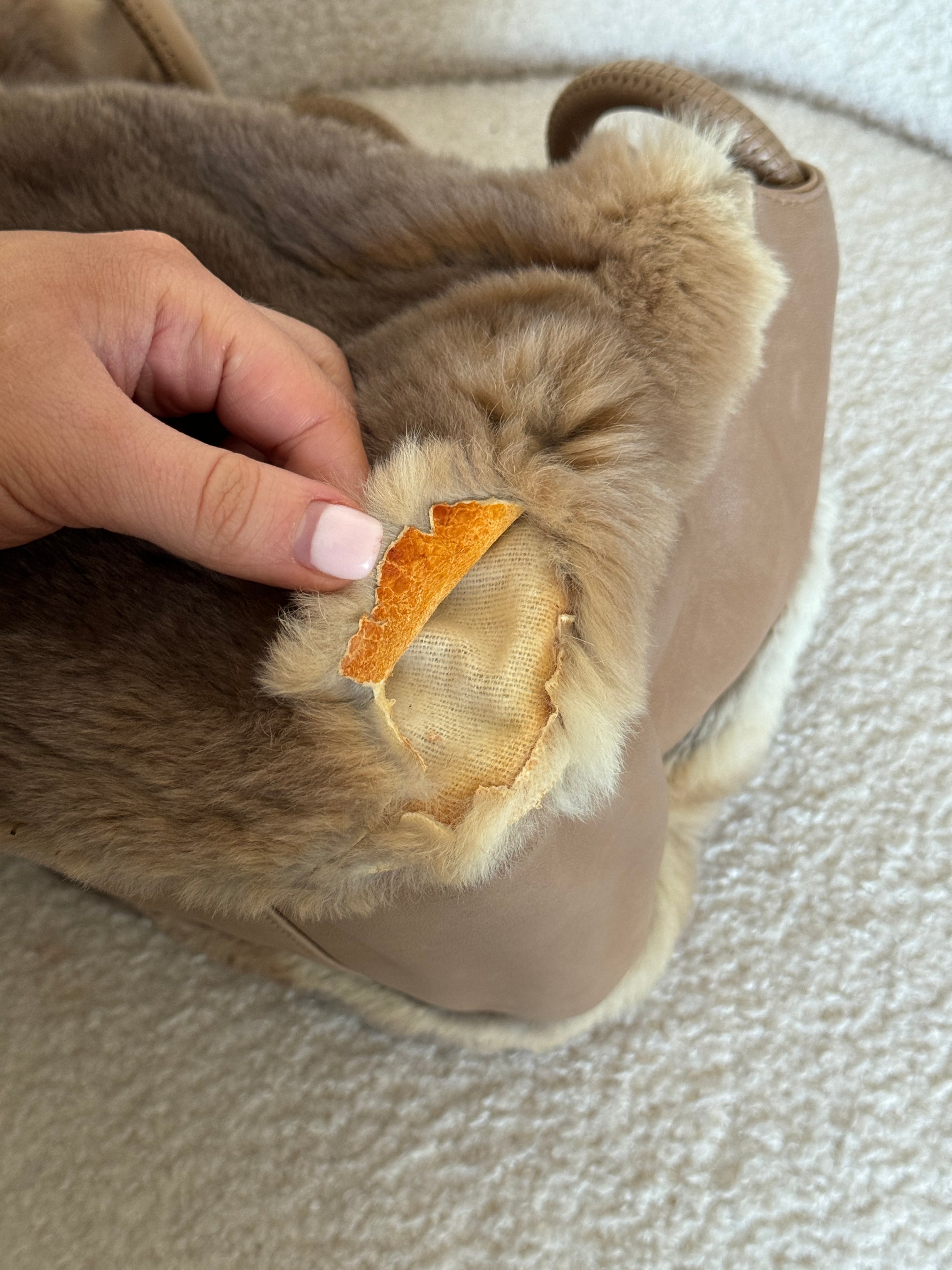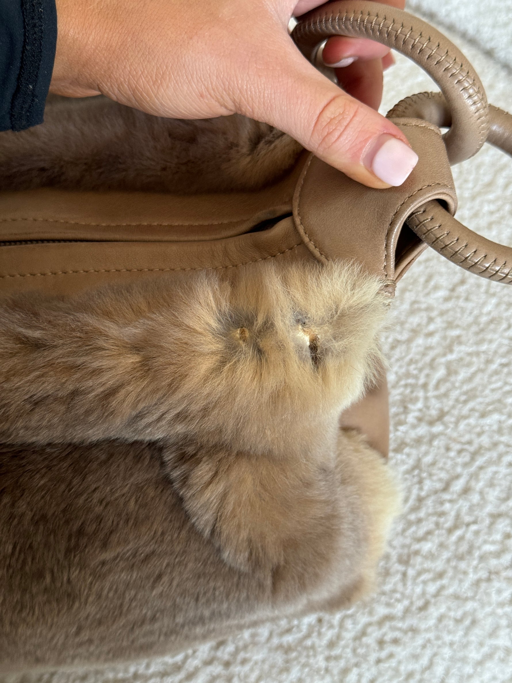 Outside: A couple of very faint marks/ scratches to the leather which aren’t noticeable. There are a couple small holes in the material beneath the fur (pictured) which aren't noticeable unless looked for as the fur covers over them. 2 rips in the fur which is peeling away from the material - this could be repaired professionally if you wish. Damage listed is on one side of the bag.