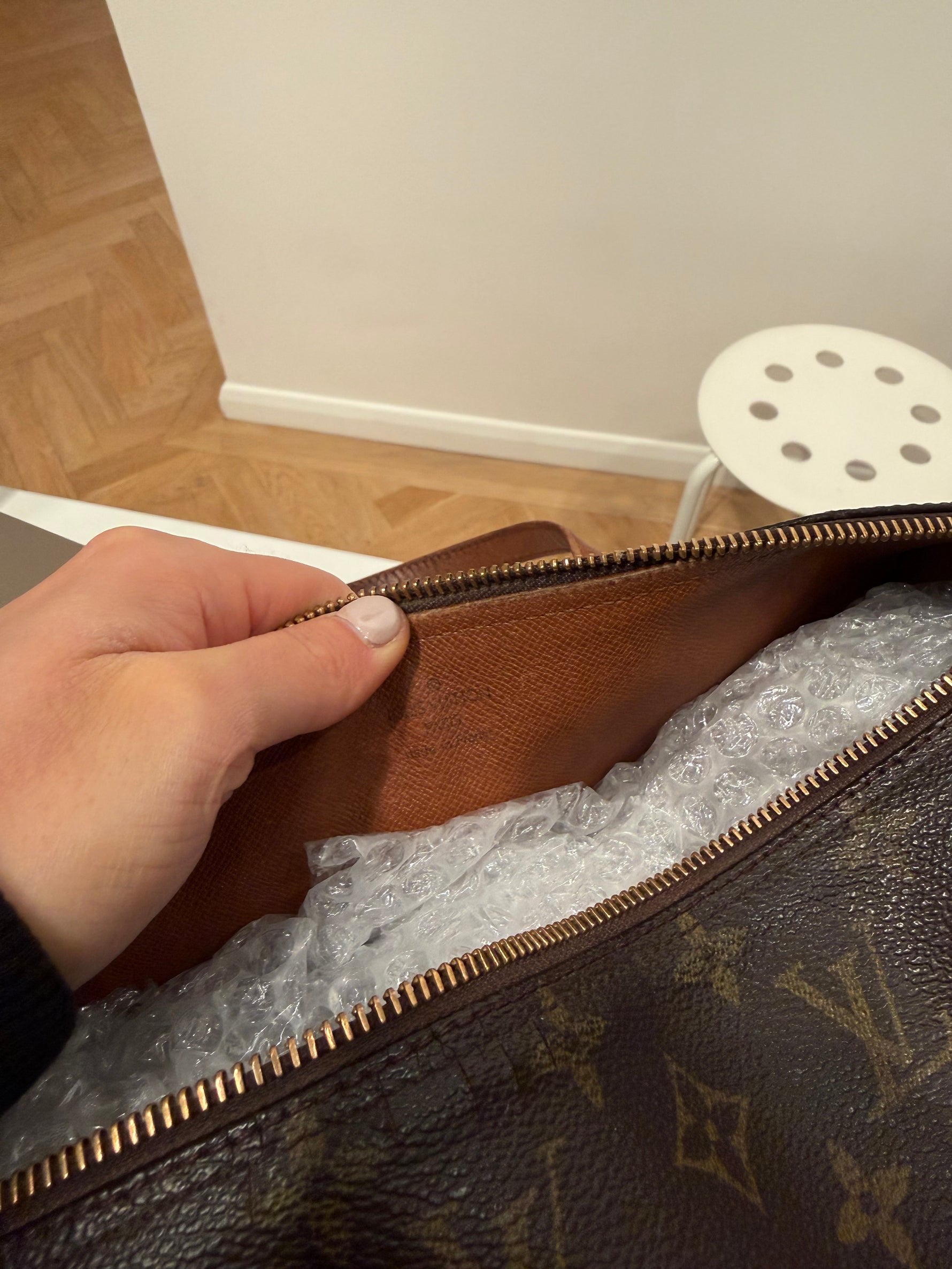 Outside: light wear to the handles. Some minor cracking to the pvc along the zipper line but this isn’t noticeable when worn.