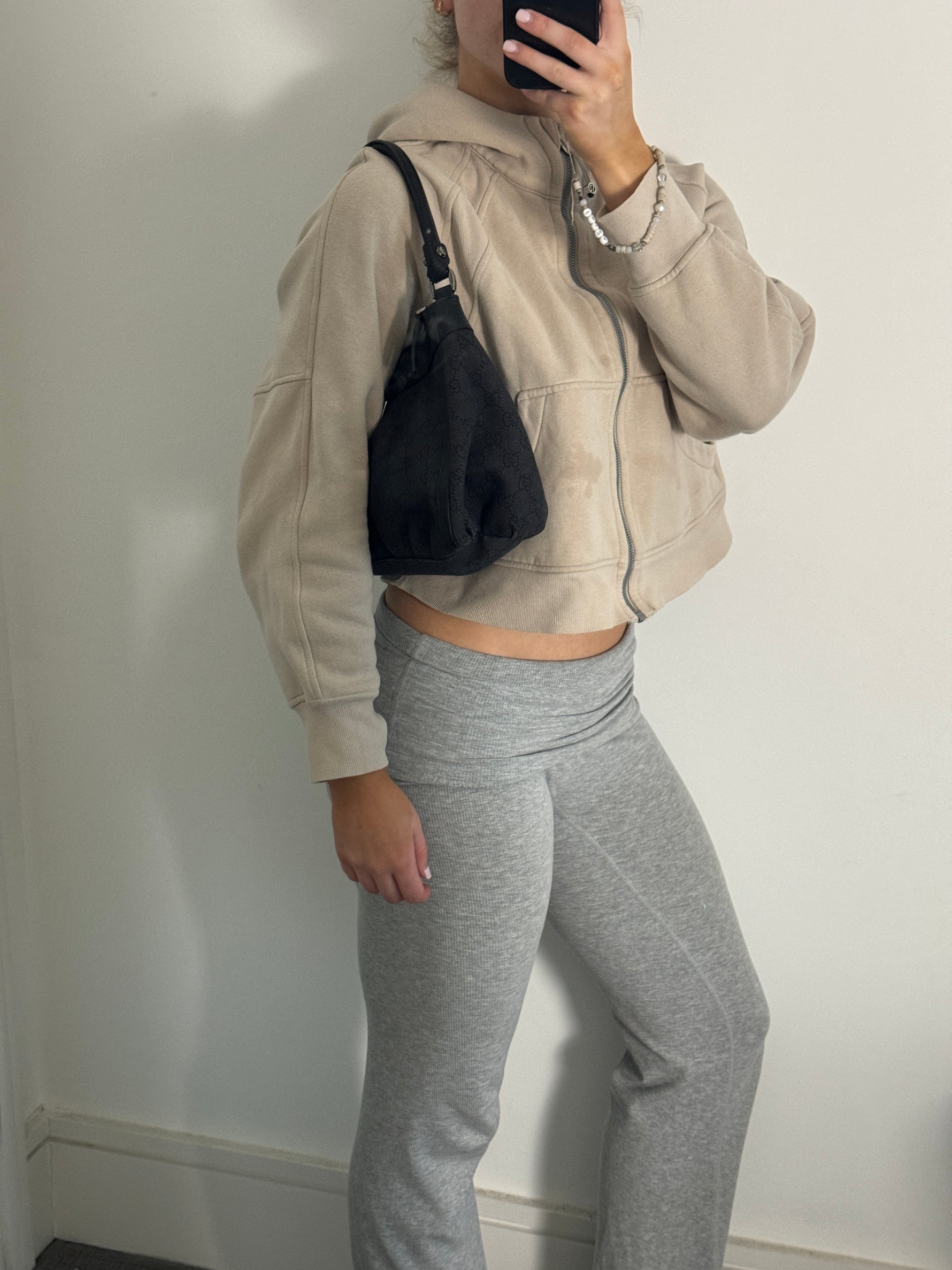 Outside: Body of the bag & leather handle in excellent condition throughout. Small scratched on D ring hardware & one tiny scuff to leather on bottom corner.
